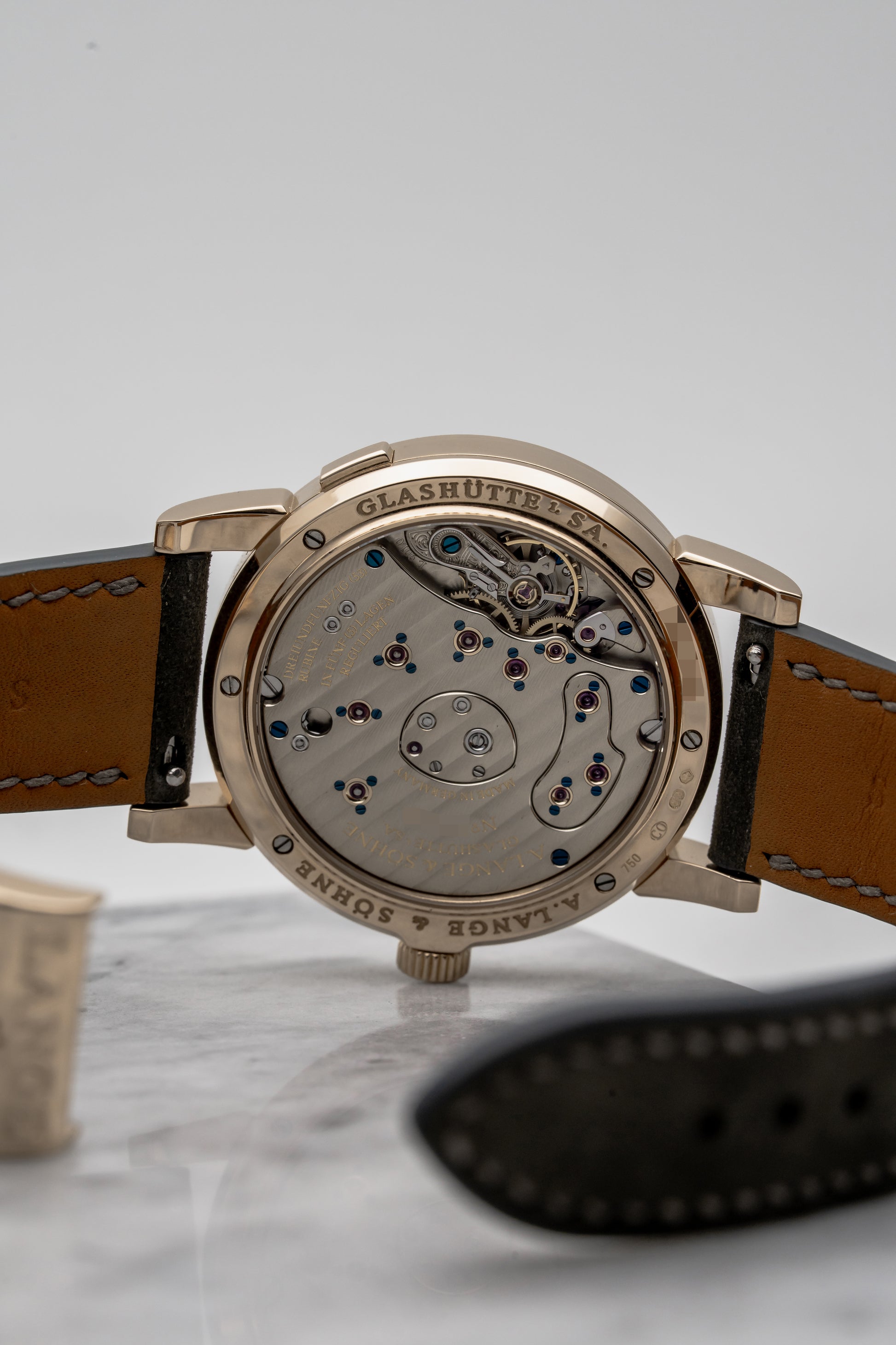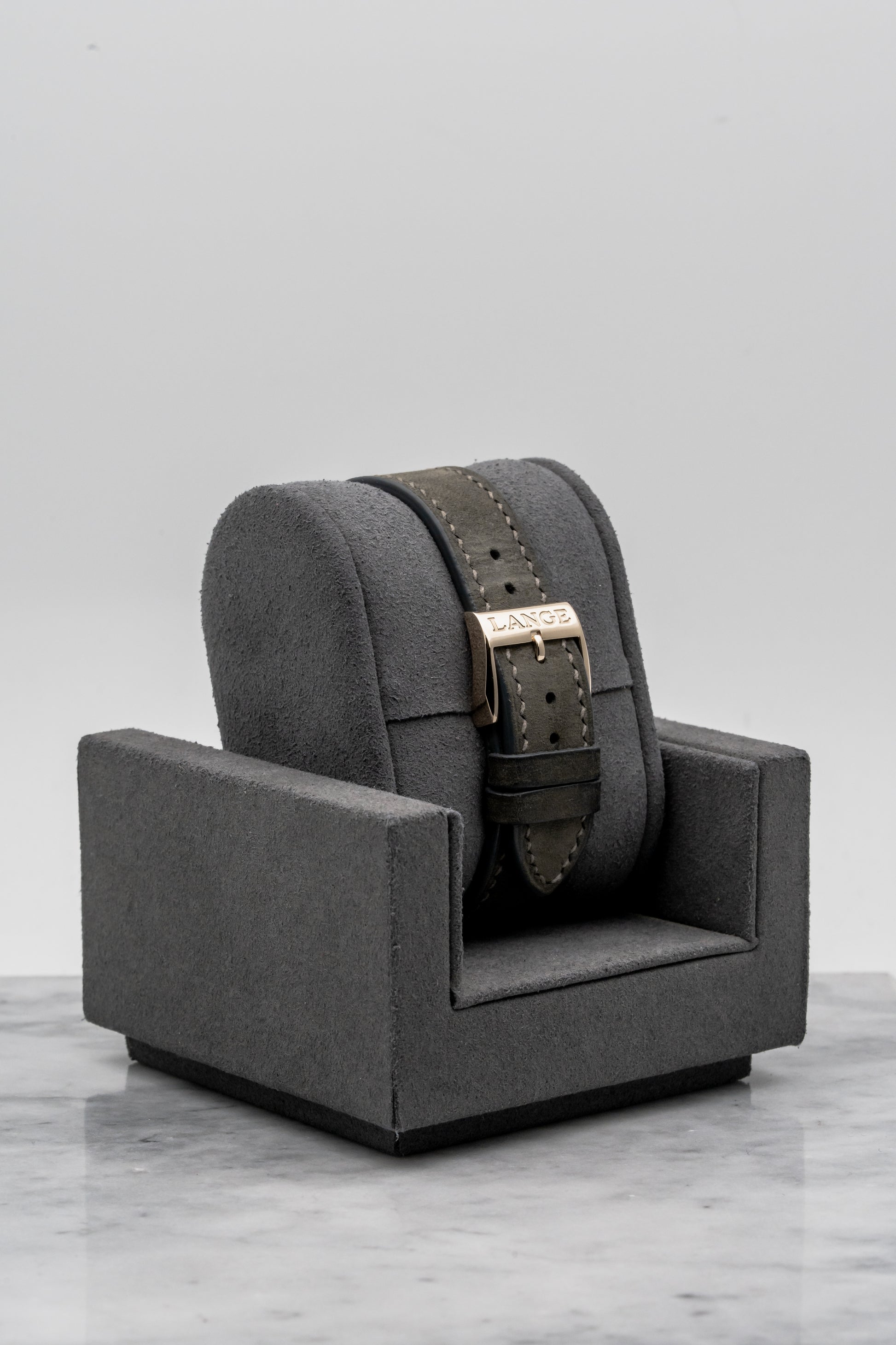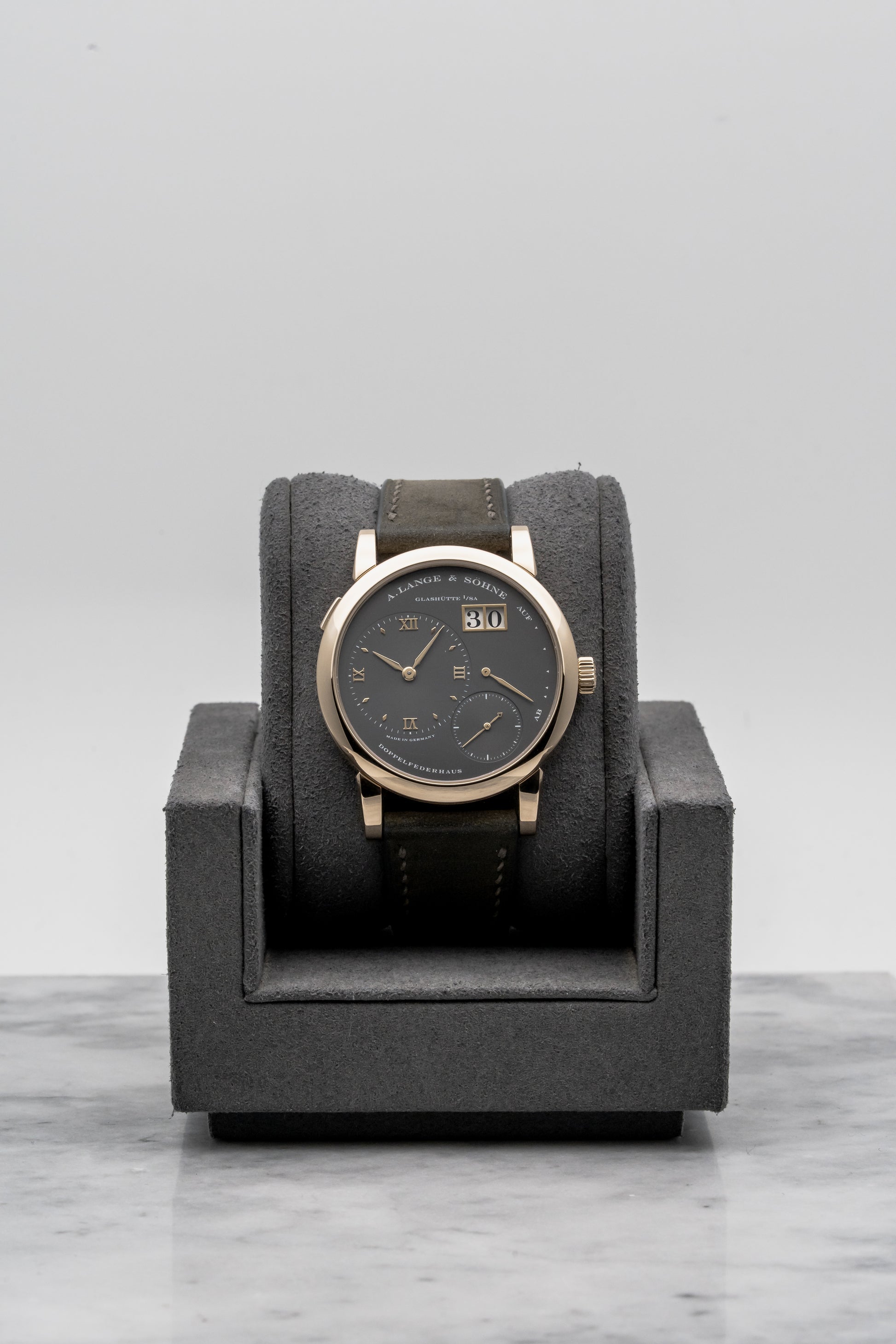 The 101.033 is especially respected for its original proportions and classical execution. At 38.5mm, it reflects the dimensions envisioned at the model’s debut, giving the dial a sense of balance that many collectors consider definitive. The grey dial offers a more understated alternative to silver, creating contrast against the warm tone of the 18K rose gold case. Powered by the calibre L901.0, this reference showcases the foundational Lange movement architecture, complete with traditional finishing that set a new benchmark for hand-wound movements in the modern era.