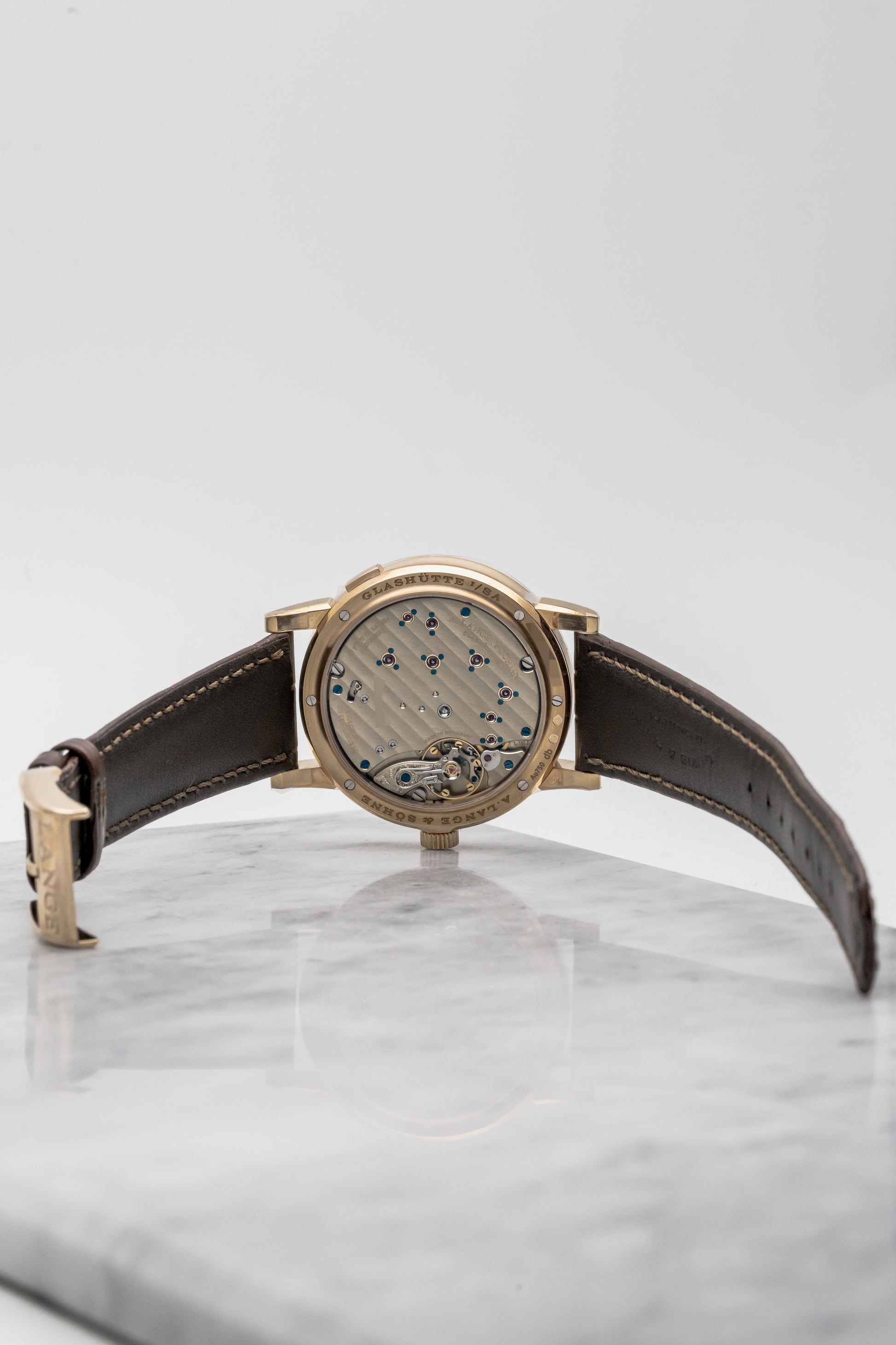 Dial: Solid Silver Dial with an Off-Center Main Time Display, Double Date Window, Power-Reserve Indicator and Sub-Seconds