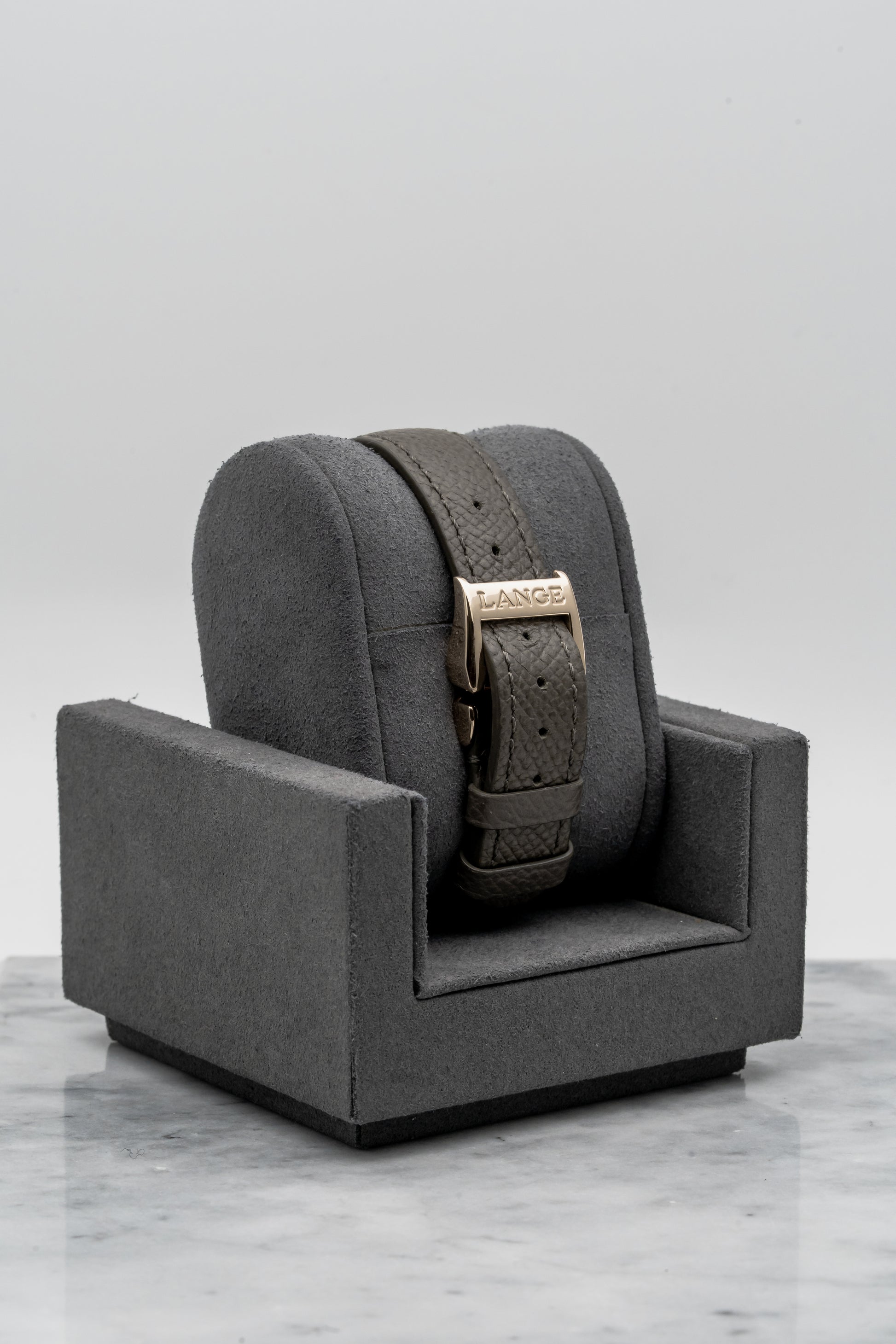 Strap: Grey Calf Leather with 18K Rose Gold Tang Buckle