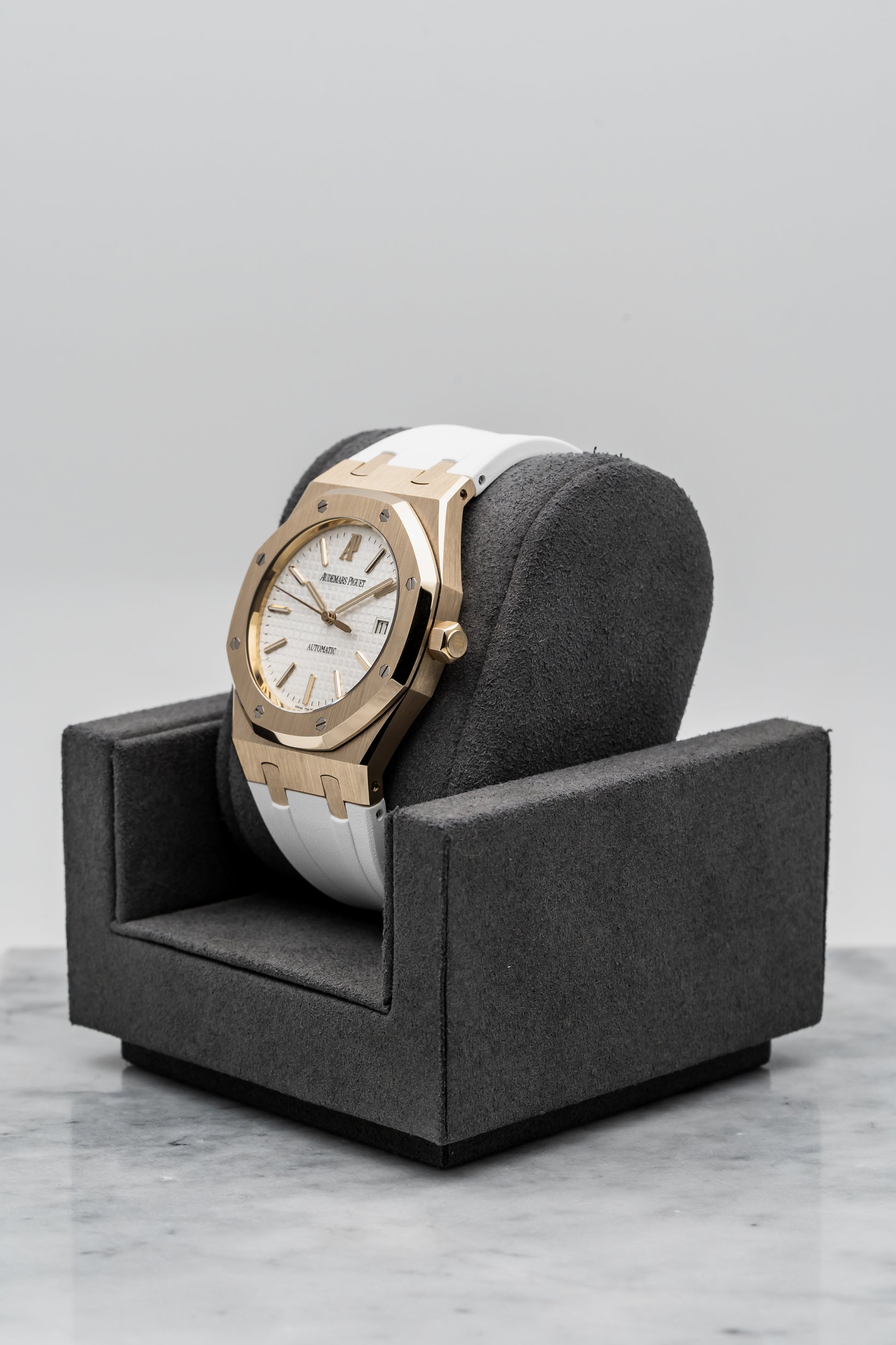- Strap: White Rubber Strap (Aftermarket) with 18K Rose Gold AP Pin Buckle