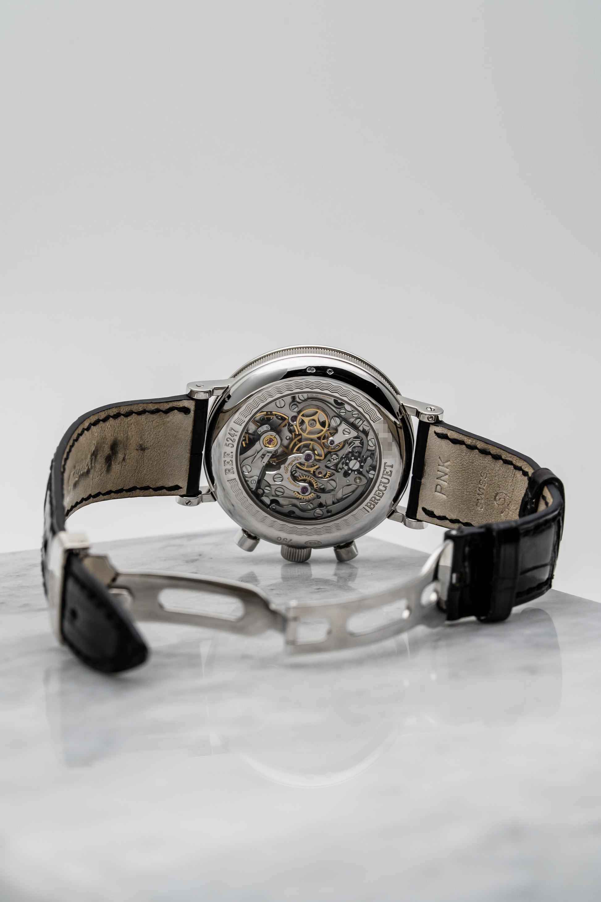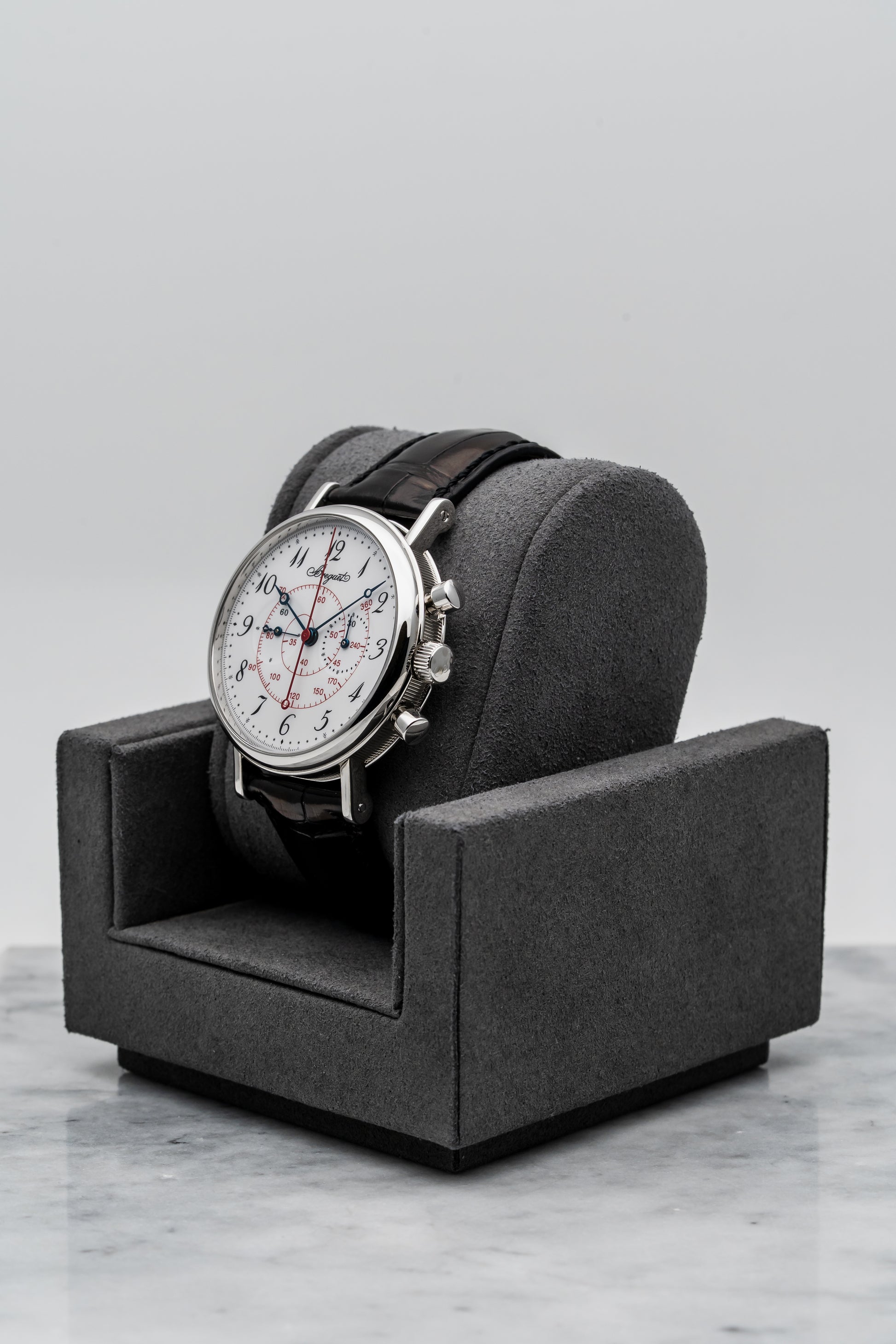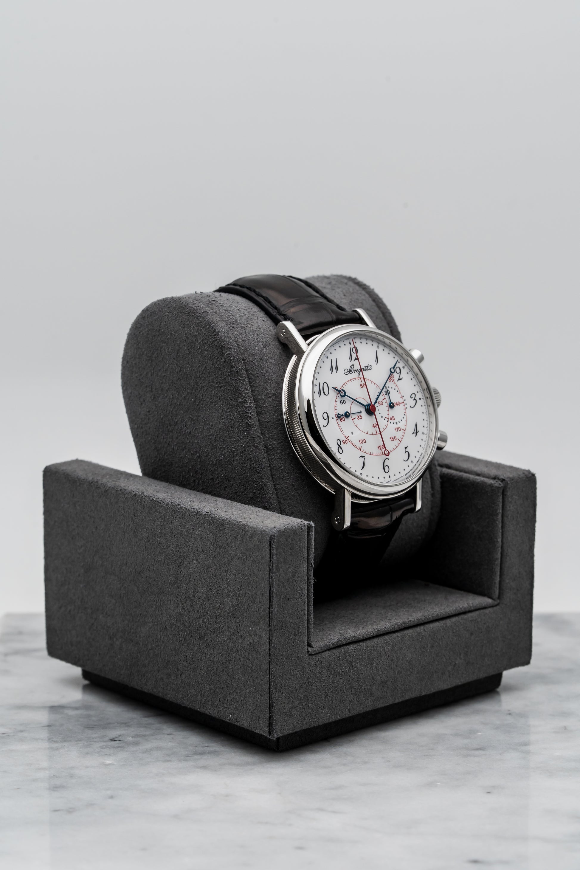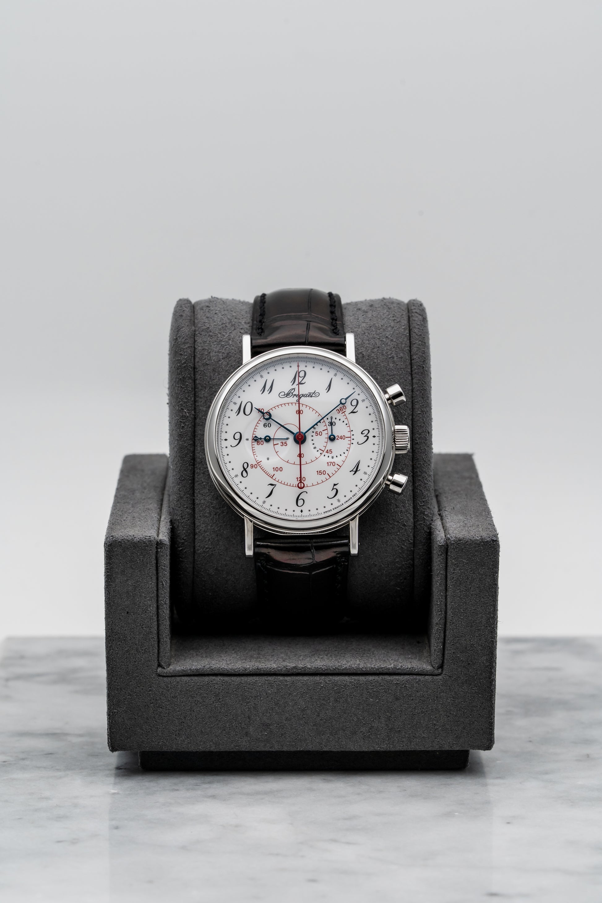 - Dial: Grand Feu White Enamel with Red Tachymeter Scale & Black Breguet Numerals