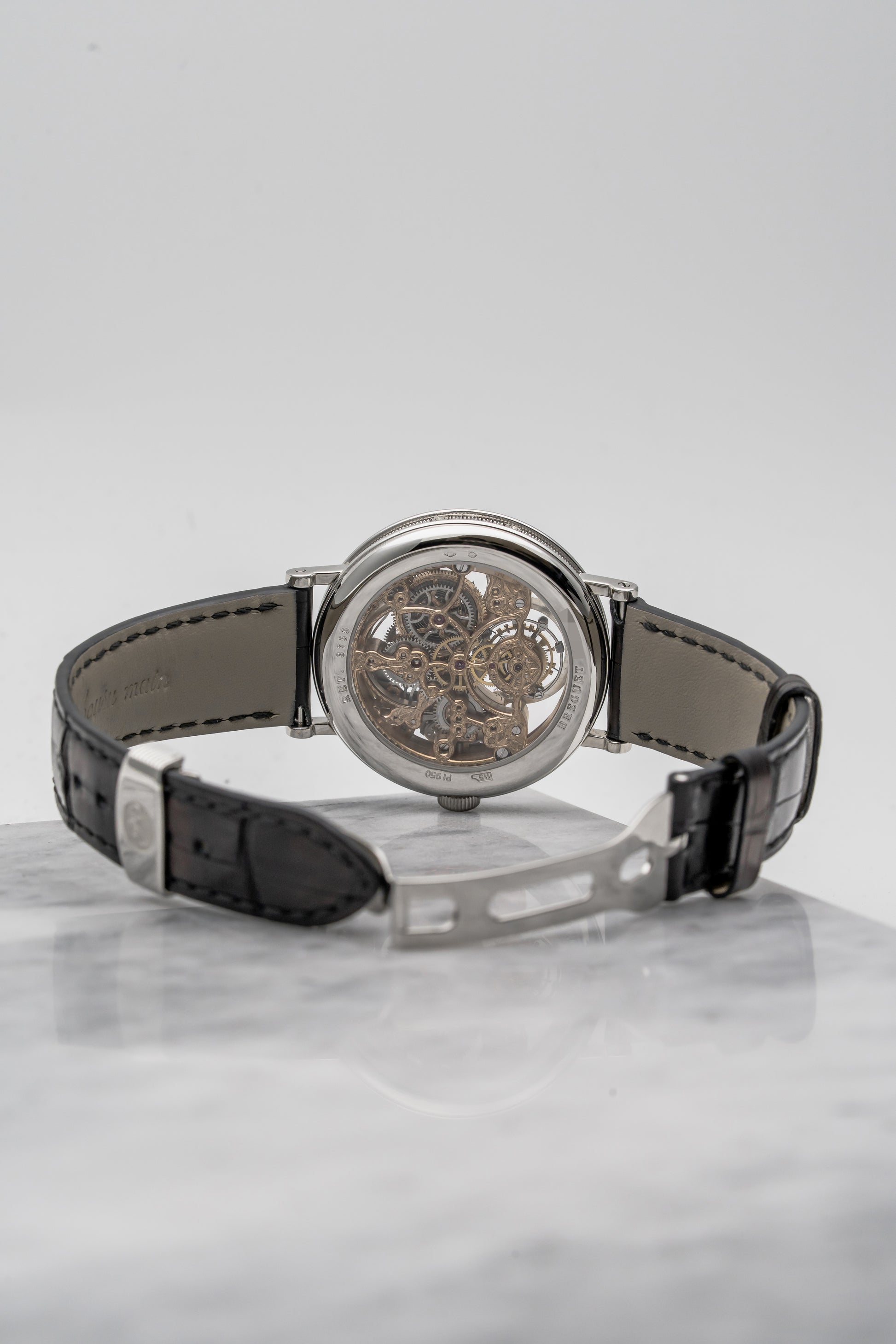 This example features a 40mm platinum case with a fully skeletonized dial, paired with a brown leather strap and secured by a platinum deployant buckle. It is powered by the manually wound calibre 558 SQ with an approximate 50-hour power reserve. Water resistance is rated to 30 meters. Any available information regarding service history, box, or papers is disclosed clearly based on confirmed details, with no assumptions made where information is unavailable.