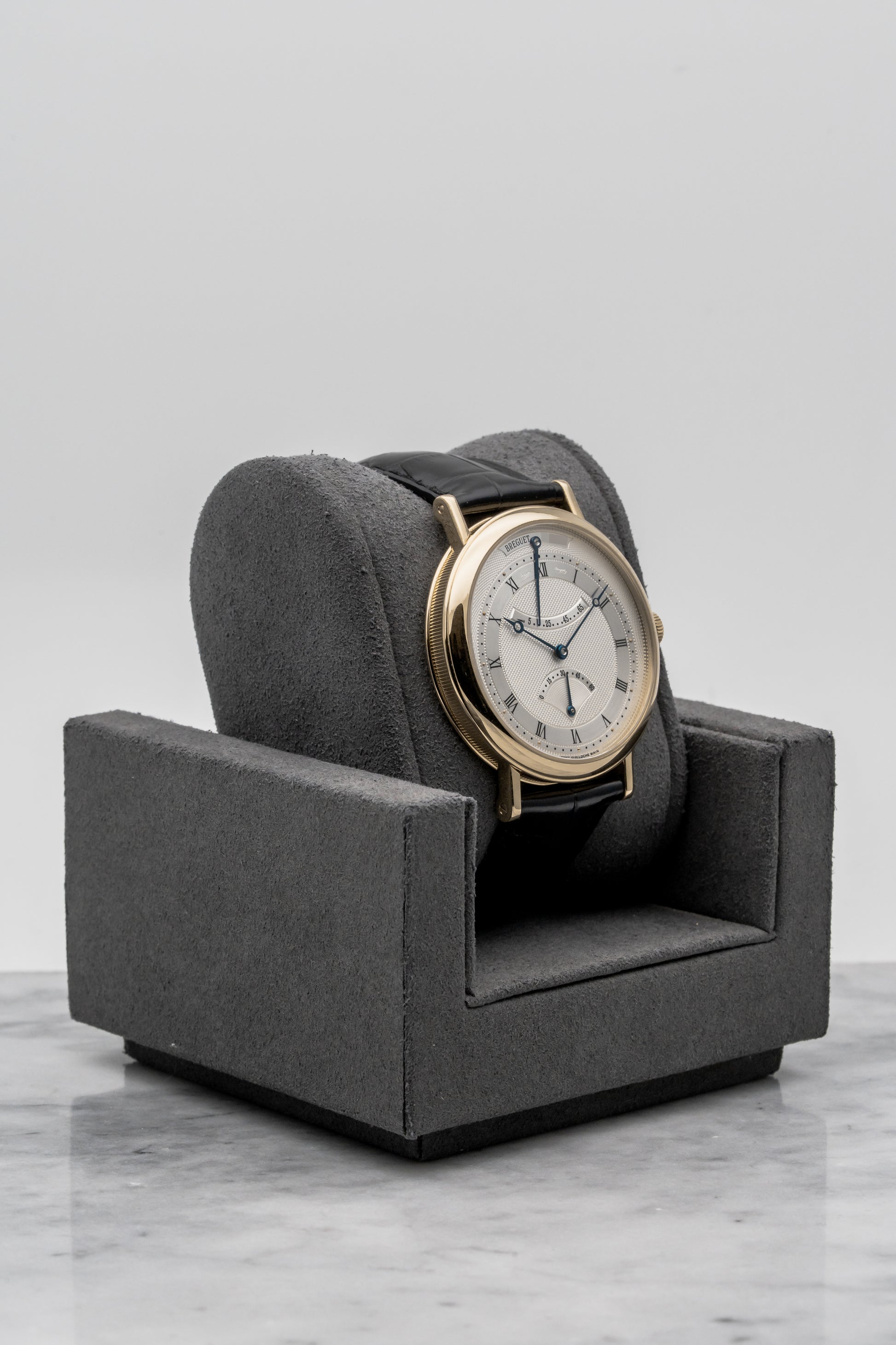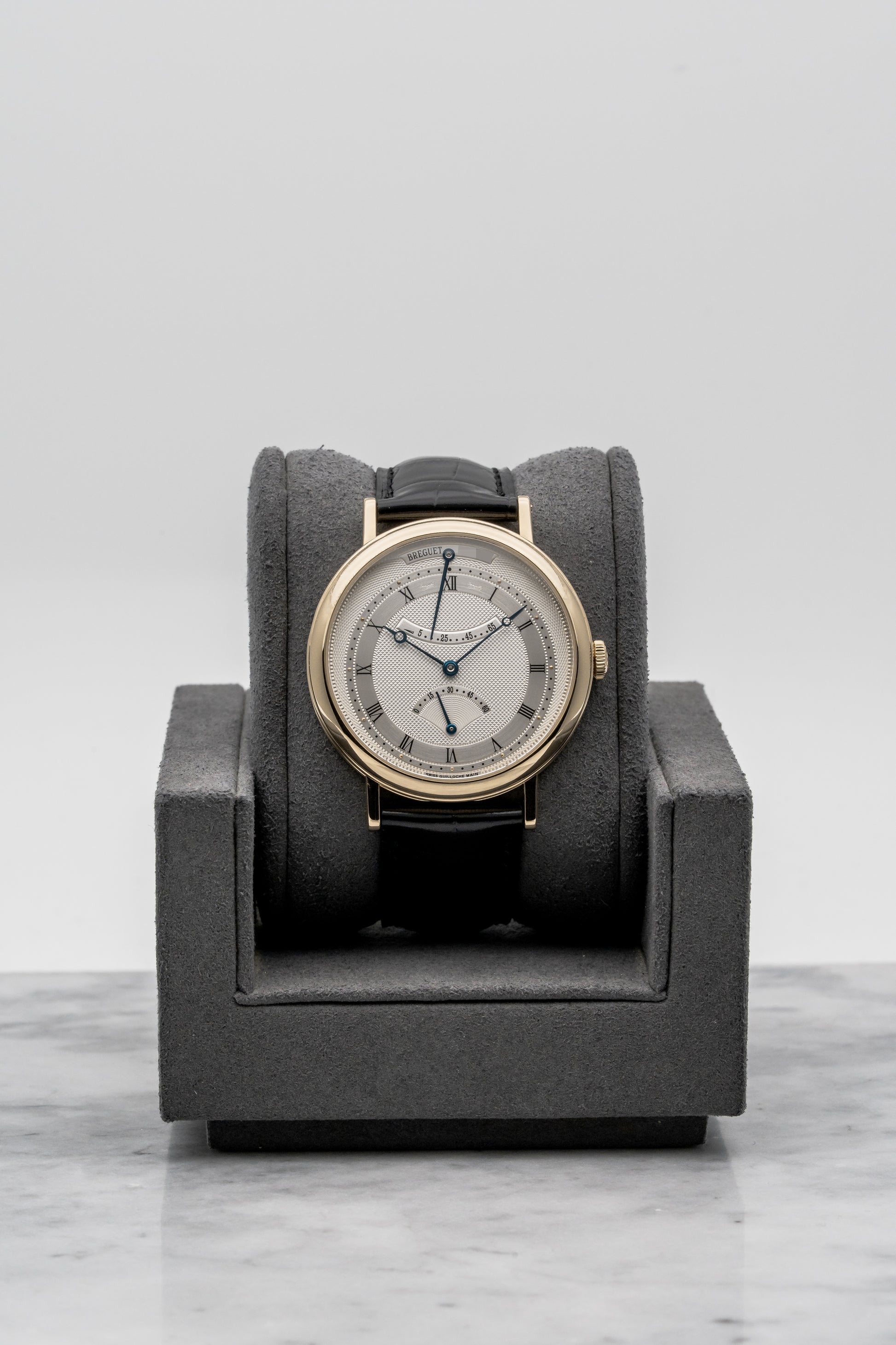 - Dial: Silvered Solid Gold Guilloché Dial with Power Reserve Indicator at 12 o'clock, and Retrograde Seconds Sub-Dial at 6 o'clock.