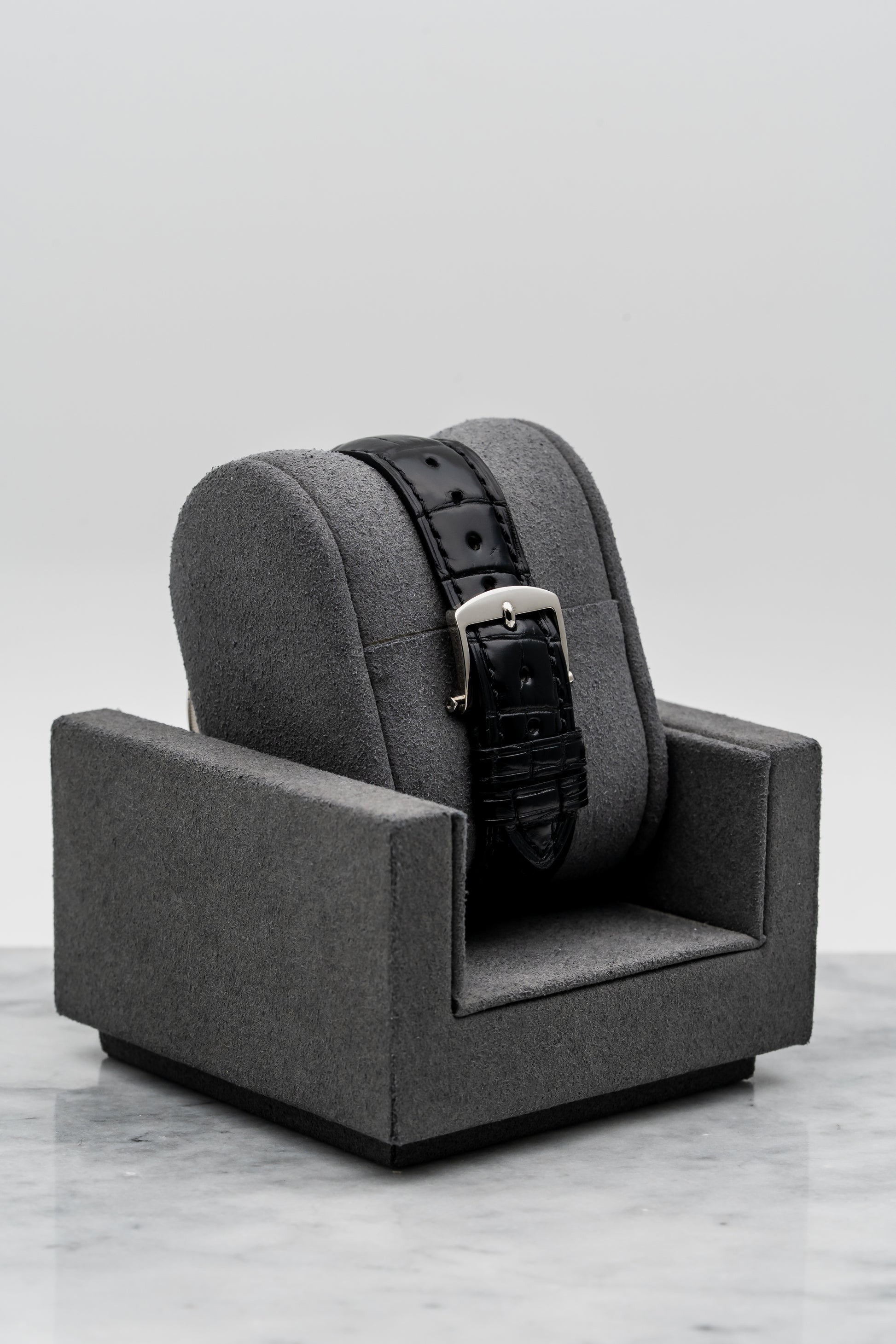 - Strap: Black Leather with 18K White Gold Folding Clasp