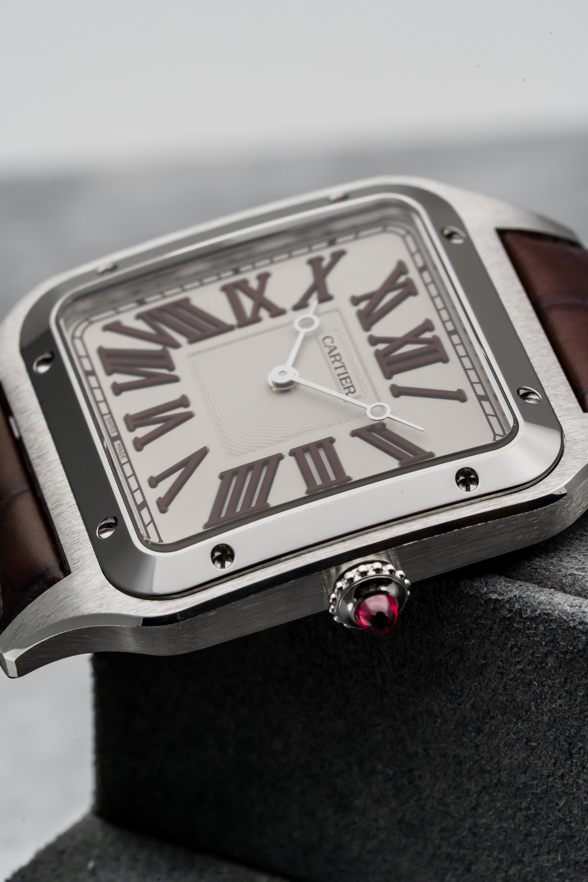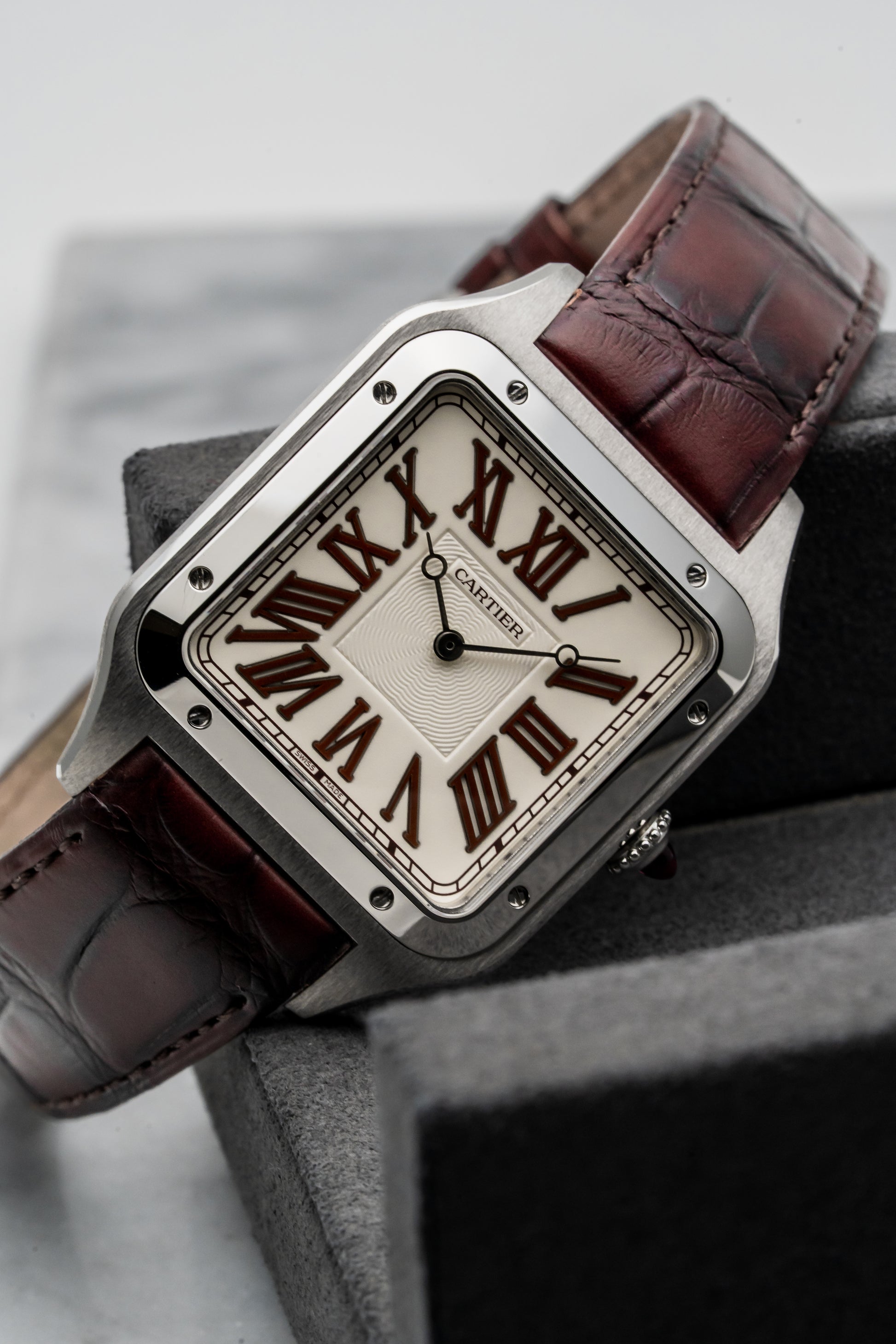 Dial: Silver Sunburst Guilloché with Bordeaux Roman Numerals & Sword-Shaped Hands