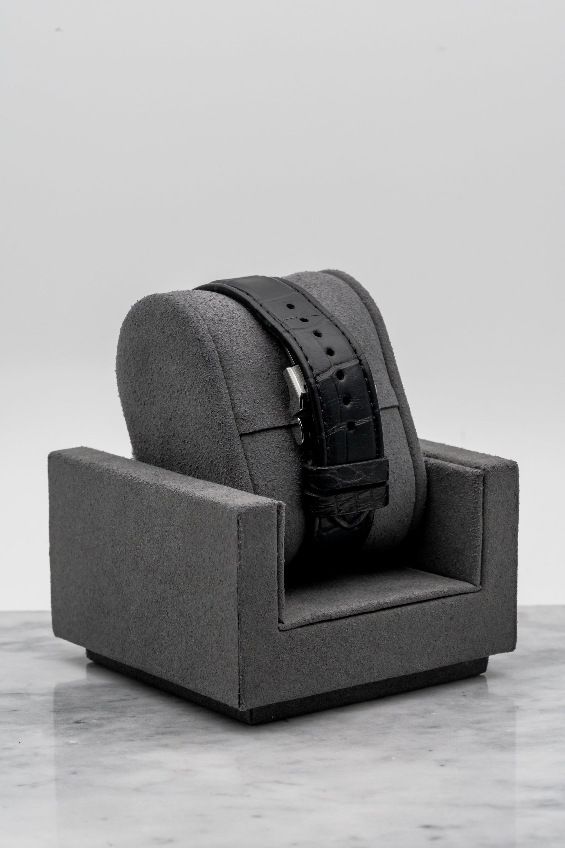 Bracelet: Black Leather Strap with Stainless Steel Deployant Clasp