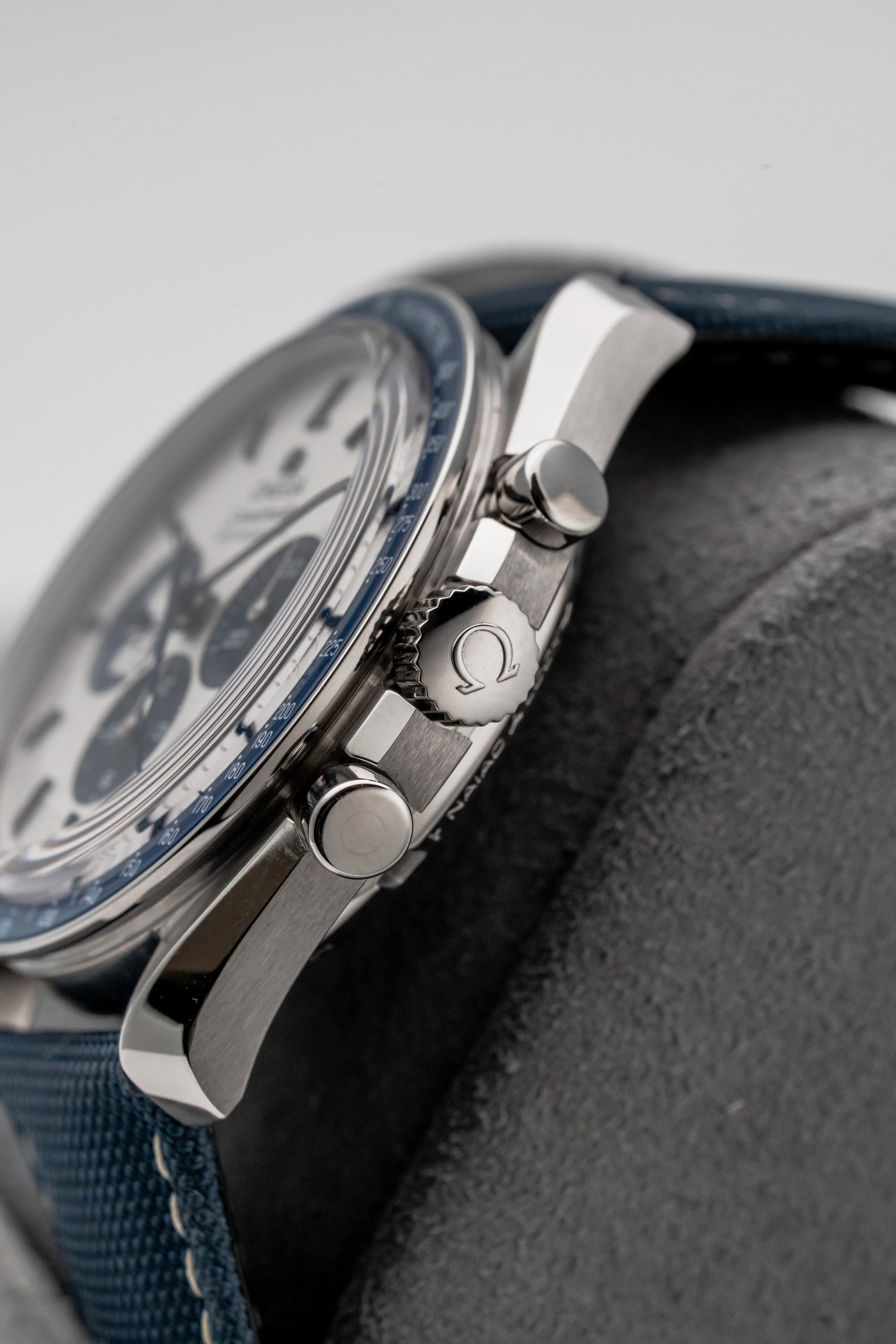 At 42mm, the watch wears exactly as a Speedmaster should: balanced, purposeful, and immediately familiar. The stainless steel case offers reassuring solidity without feeling bulky, while the blue nylon fabric strap keeps the watch light and comfortable for extended wear. On the wrist, it feels sporty and approachable, with the silver and blue colorway adding freshness without straying from the model’s core identity.