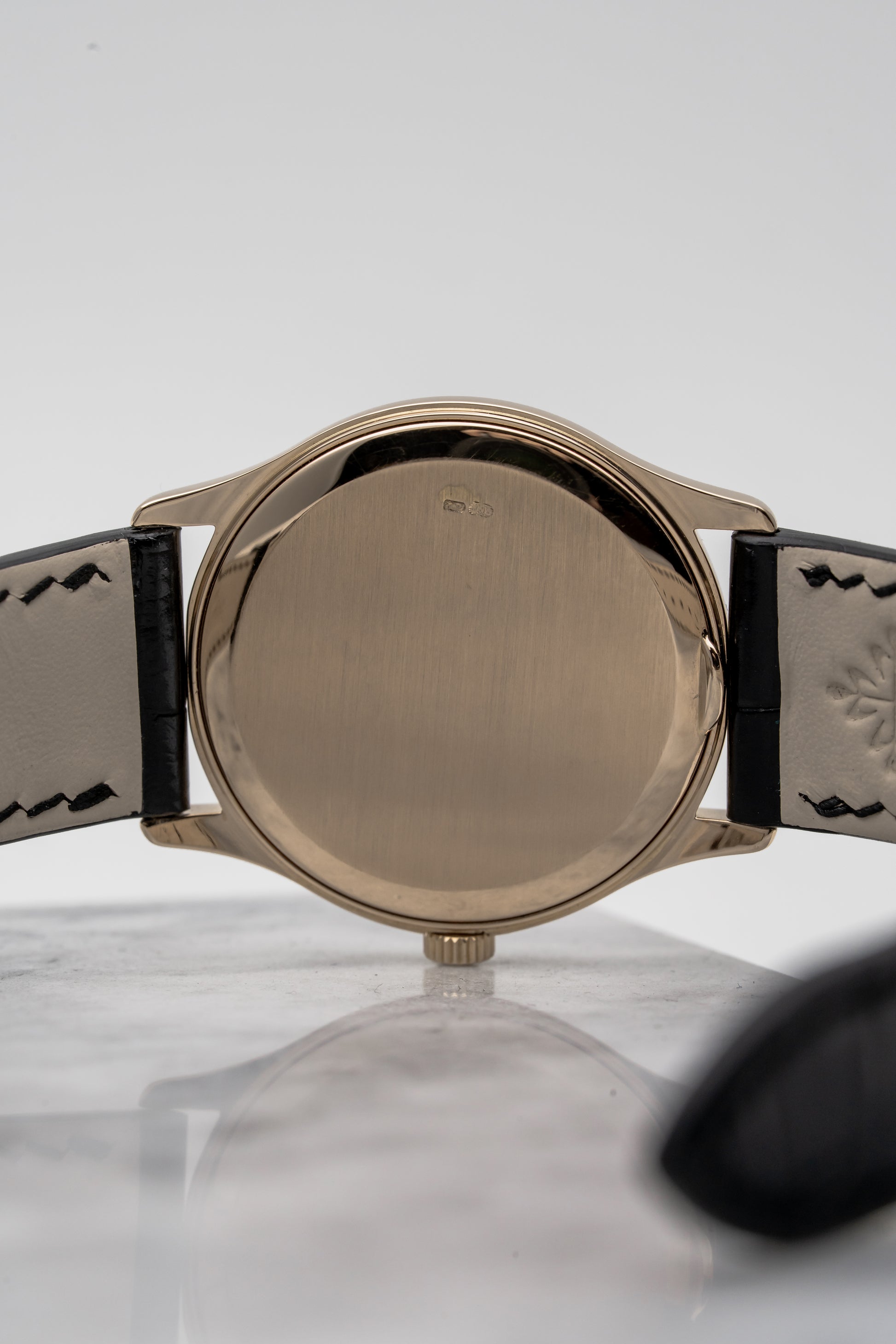 This example features an 18K rose gold case paired with a cream dial, fitted to a black leather strap and secured by an 18K rose gold pin buckle. It is powered by the manually wound calibre 215 PS with an approximate 44-hour power reserve. Water resistance is rated to 30 meters. As always, details regarding service history, box, or papers are disclosed clearly based on confirmed information, with no assumptions made where records are unavailable.