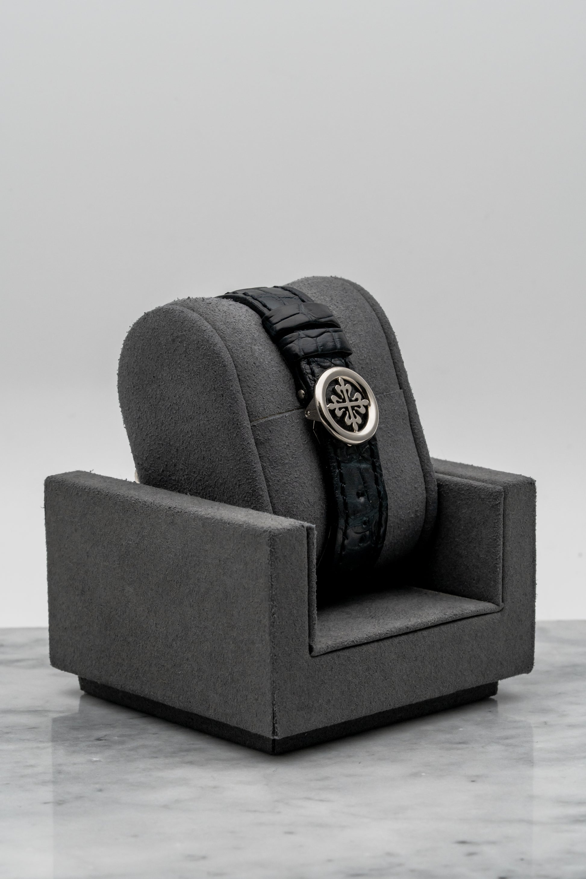 Strap: Black Leather with 18 K White Gold Folding Clasp