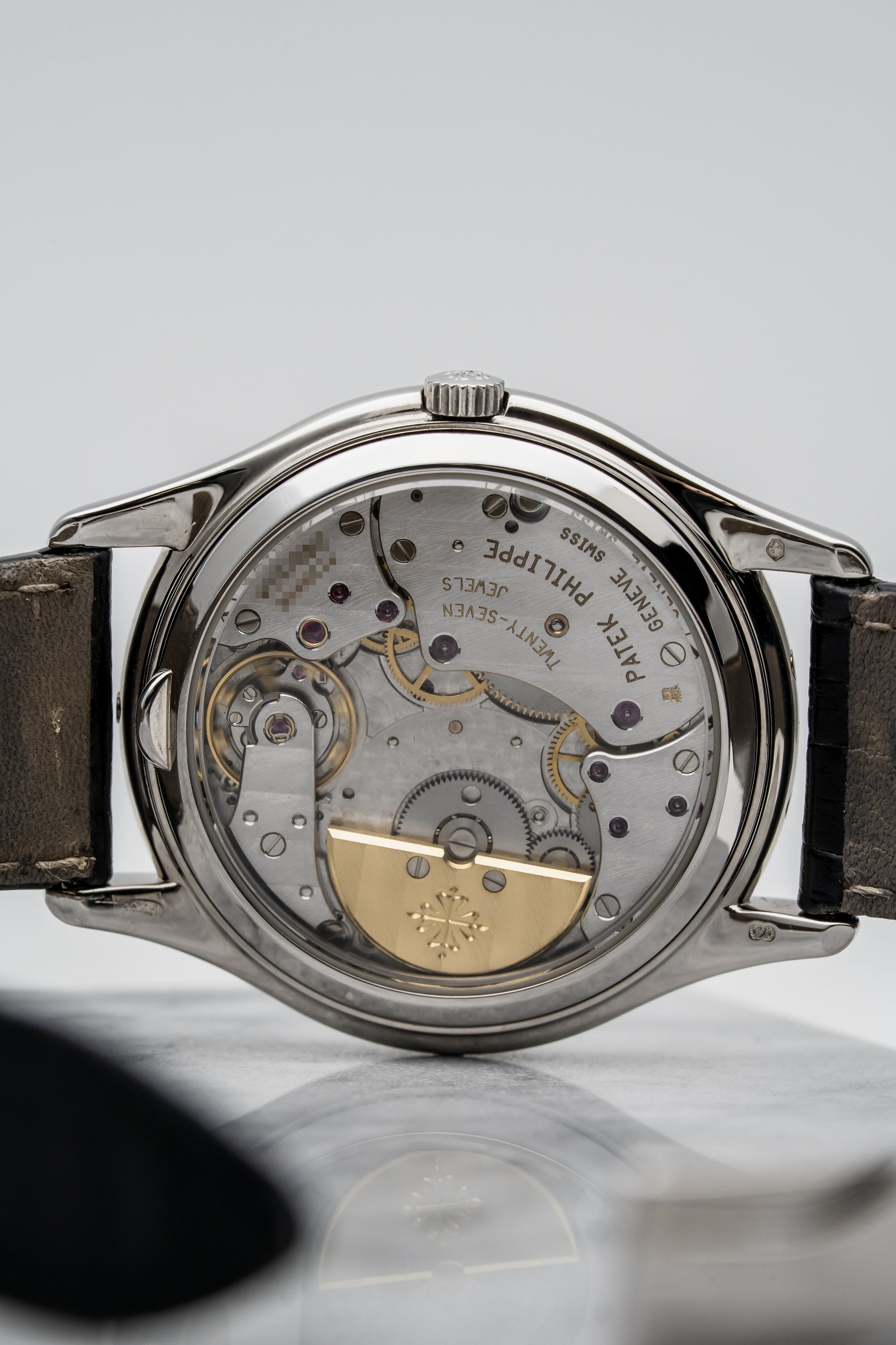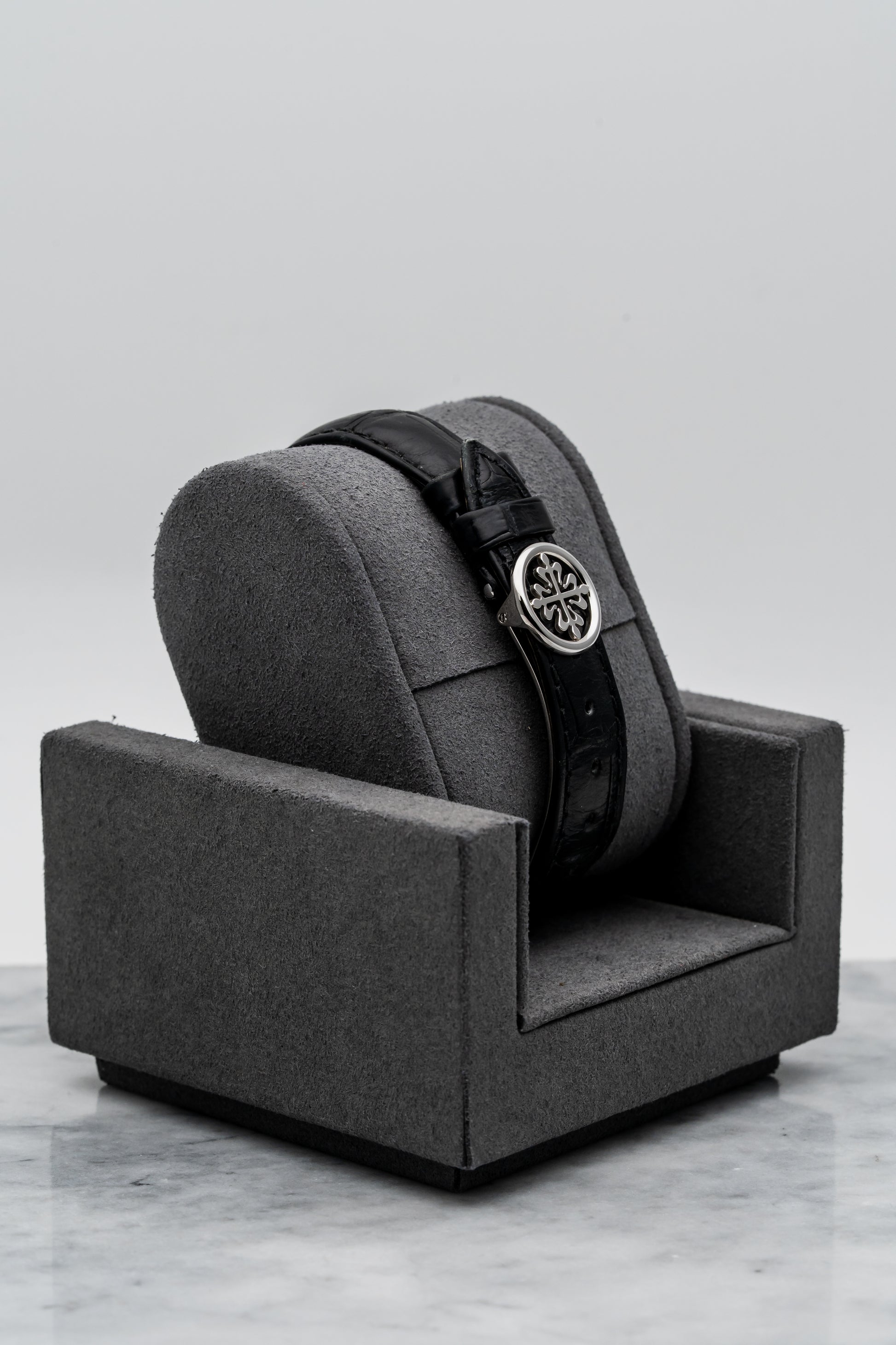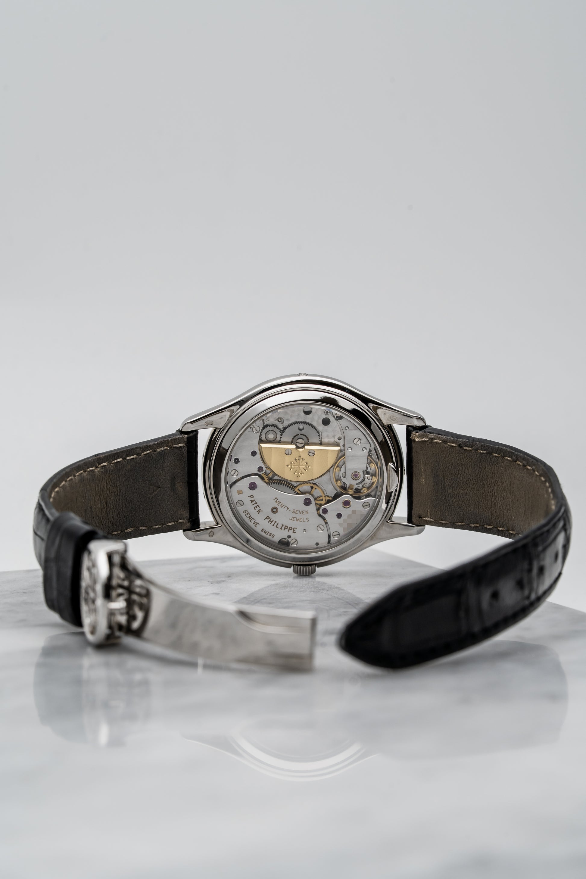 - Strap: Black Alligator Leather with White Gold Tang Buckle