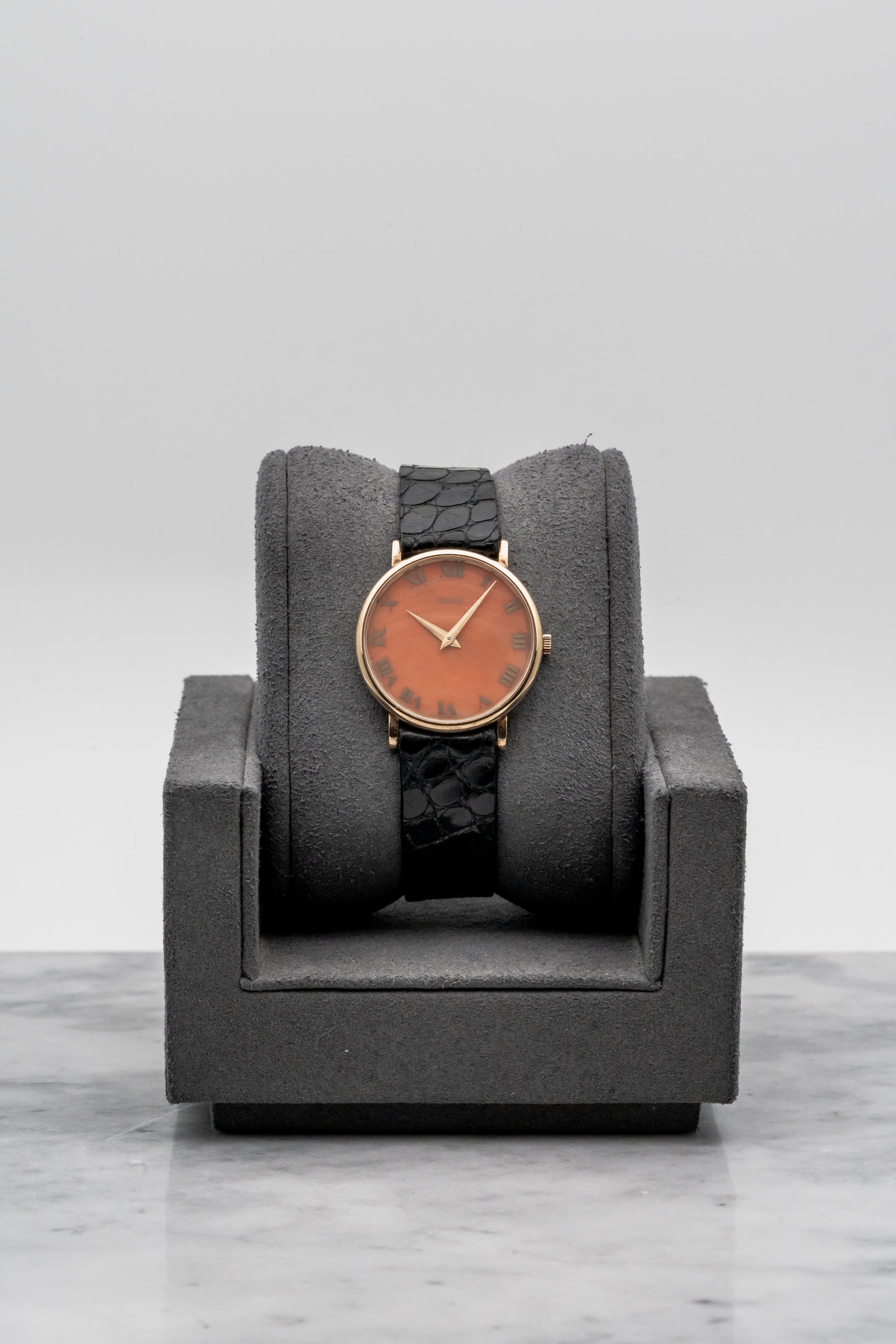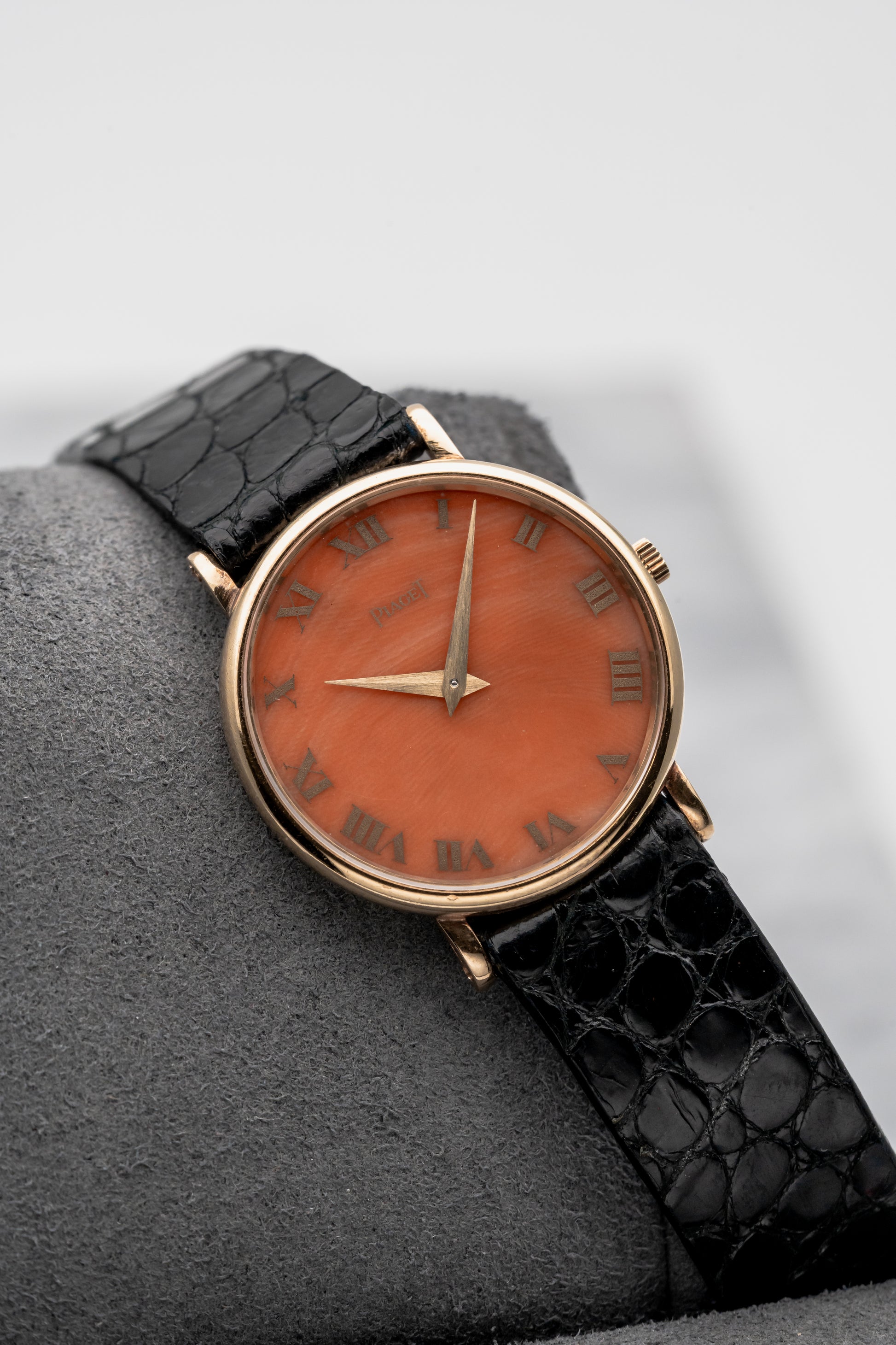 This example features a 27mm 18K yellow gold case with coral stone dial and printed Roman numerals. It is fitted to a black leather strap secured by a gold pin buckle and powered by the manually wound Piaget calibre 9P with approximately 38 hours of power reserve. As always, details regarding condition—particularly the integrity of the natural stone dial—service history, and set completeness should be communicated clearly based only on confirmed information.