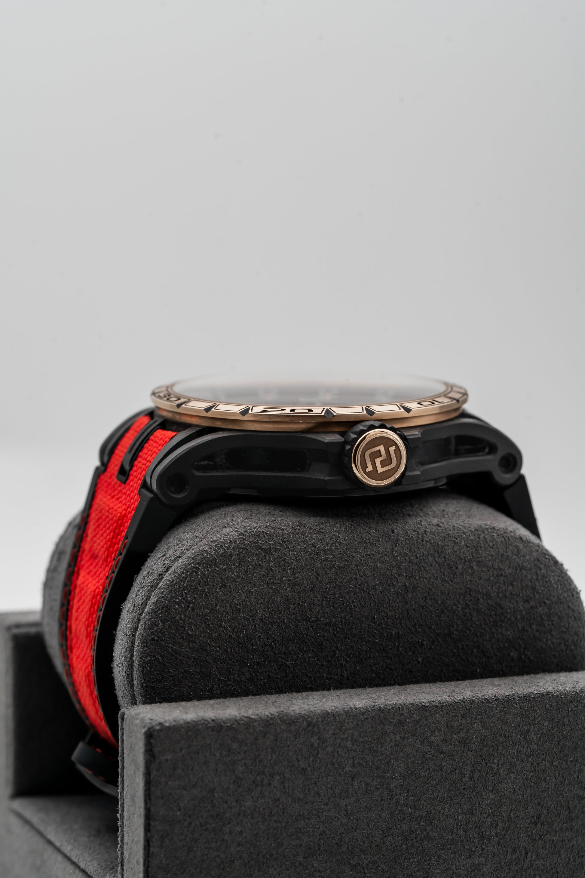 - Case Material: Carbon with 18K Rose Gold Bezel