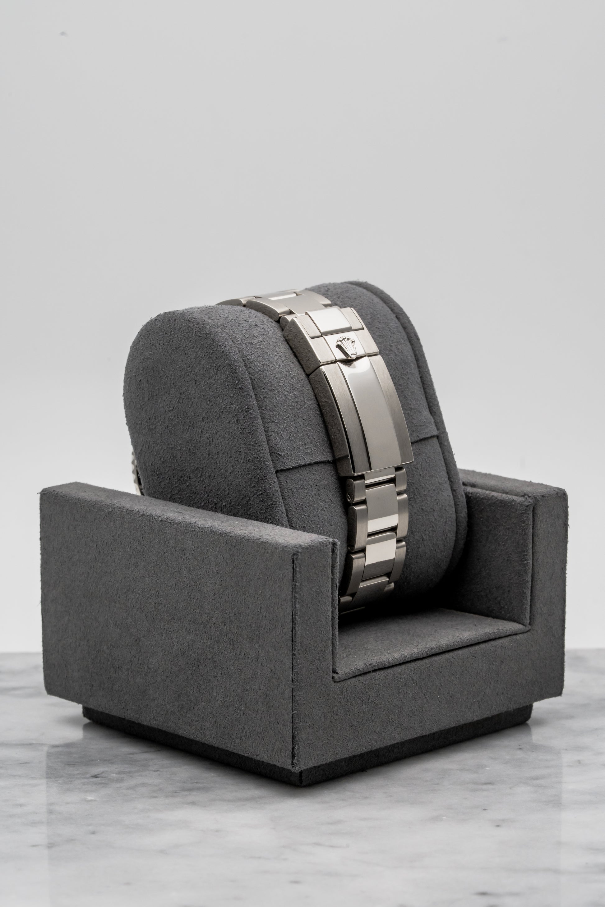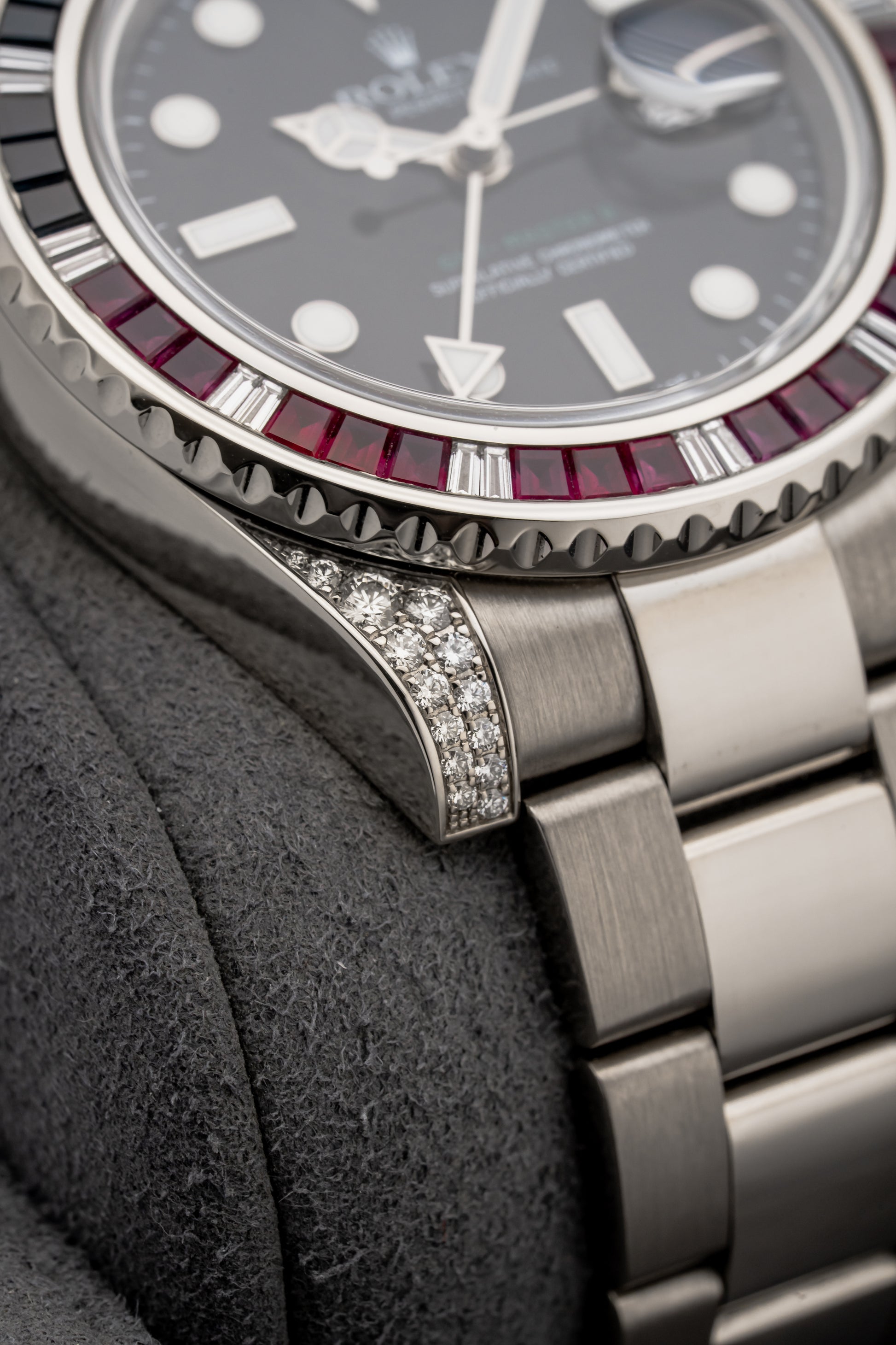 - Case Material: 18K White Gold with Factory Diamond-Set Lugs & Sapphire/Ruby SARU Bezel