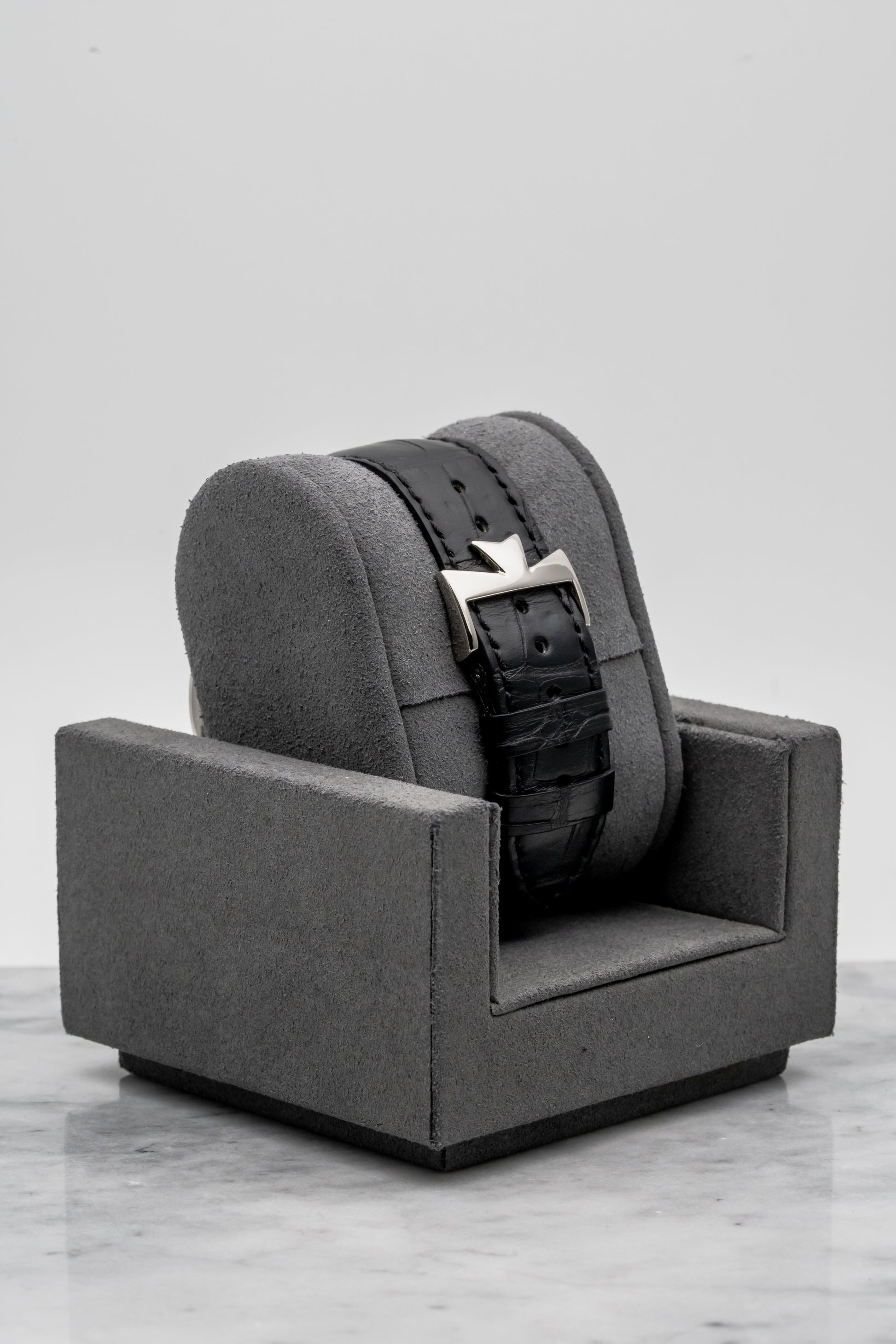- Strap: Black Leather Strap with an 18k White Gold Deployant Buckle